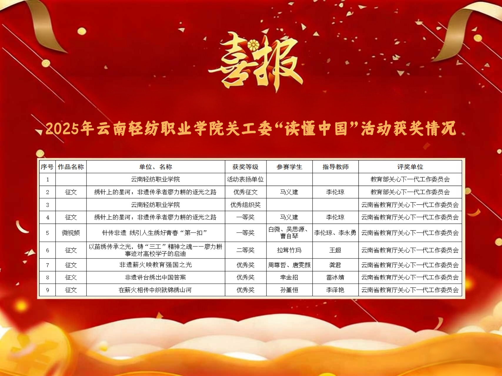此次评选,我校成果丰硕。学校获评教育部“读懂中国”活动表扬单位与云南省“读懂中国”活动优秀组织奖,双重荣誉彰显组织实力;征文《绣针上的星河:非遗传承者廖力耕的逐光之路》喜获部级优秀征文与省级一等奖,成为本次活动的亮眼佳作。此外,省级奖项收获颇丰,微视频《针传非遗线引人生...