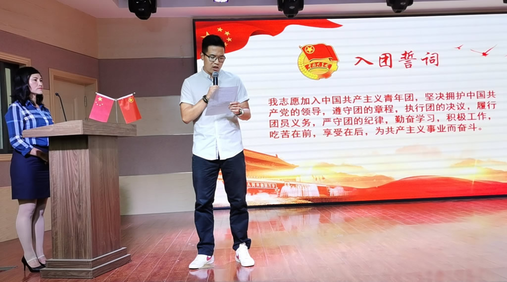 在校团委学习委员鲁华老师的带领下,全体新团员面向团旗,右手握拳高举,庄严宣誓。