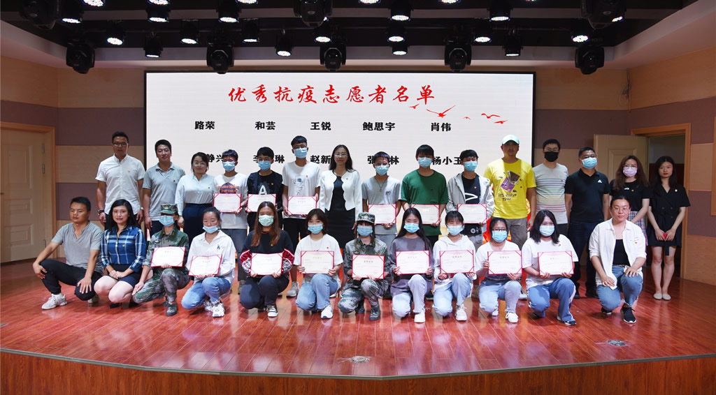 ▲ 校领导与受表彰的15名优秀抗疫志愿者合影