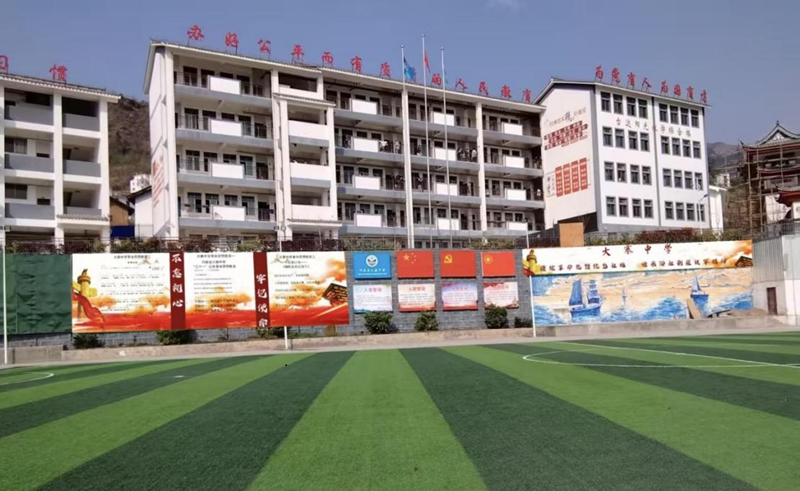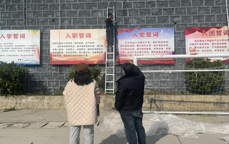 工作中,支教团队聚焦本地红色资源,围绕“红色革命文化”主题,致力强化师生爱国情怀与历史使命感,重点打造红色校园党建文化宣传。团队精心选址,围绕“大寨中学革命思想教育”三大板块,在教学楼前、操场旁等醒目位置设计宣传栏。内容上突出文化特色,围绕大寨中学革命思想教育,选取一段红色记忆之“三个不相信精神”、一首红色歌曲之《中华少年》,一个红色口号之“我们生在红旗下”等文化元素进行艺术创作。