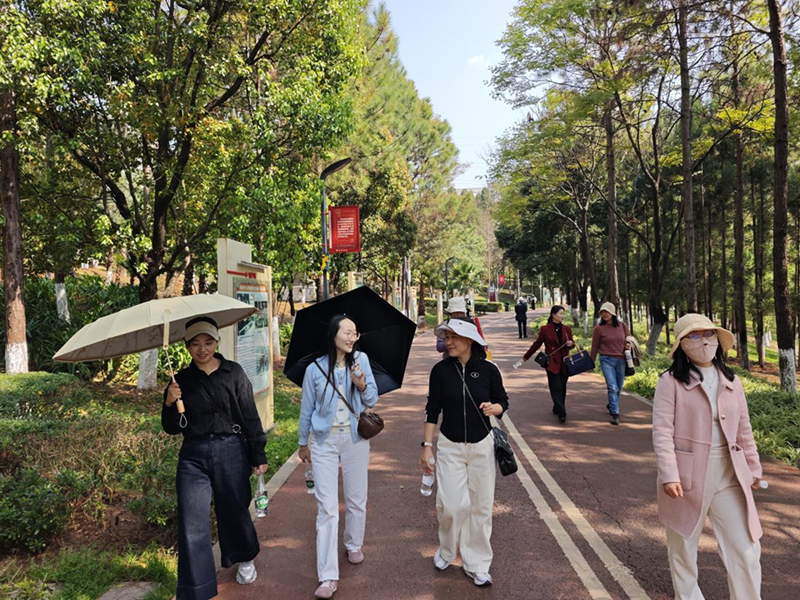 沿着宁湖步道,女教职工们阔步前行,用脚步丈量历史,用汗水致敬百年。沿途绿树碧波,大家在运动中感受“绿美春城”建设成果,互帮互助,展现出文明和谐的团队氛围,成为文明校园创建的生动注脚。傍晚,大家共进晚餐,在欢声笑语中增进情谊。
