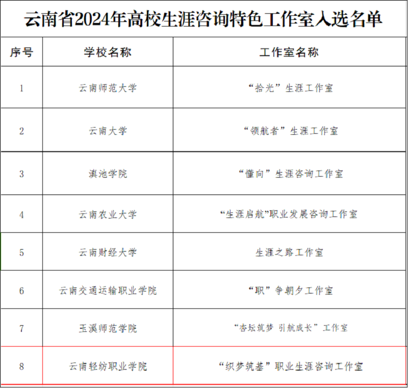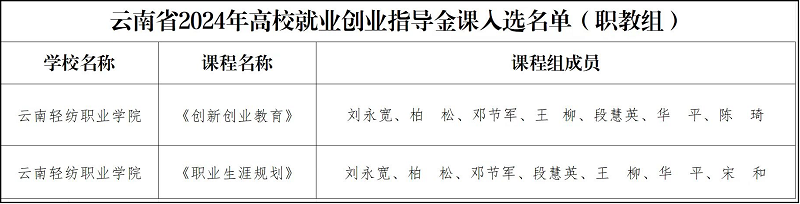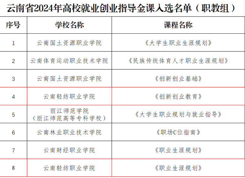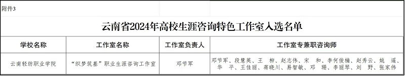 近日,中共云南省委教育工委公布了云南省2024年生涯教育和就业指导“四个一”活动之就业创业指导金课、直播课和生涯咨询特色工作室的遴选结果,学校《创新创业教育》和《职业生涯规划》两门课程成功入选本年度云南省高校就业创业指导金课名单。同时,学校“织梦筑基”职业生涯咨询工作室也荣获云南省高校生涯咨询特色工作室称号。