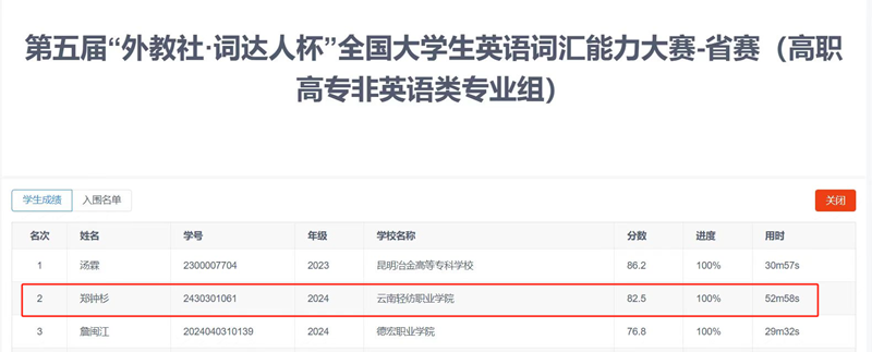 近日,2025年"外教社·词达人杯”全国大学生英语词汇能力大赛省赛落下帷幕,由通识教育中心王雪睿老师指导的郑钟杉同学在高职高专非英语类专业组中获得全省排名第二的优异成绩,成功晋级国赛!