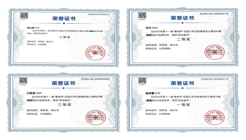 专业技能类:33名同学获第六届“衡信杯”全国个税精英挑战赛二等奖;8名同学获第十一届“衡信杯”全国大学生智慧税务大赛奖项;3名同学分别带领团队获第十一届“东方财富杯”全国大学生金融挑战赛省赛三等奖;4名同学获第五届“立信杯”全国会计技能大赛(手工账务处理)优胜奖。