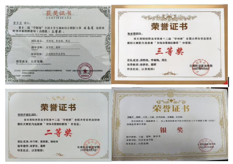 创新创业类:1人获中国国际大学生创新大赛校级银奖;6人分获第十二届“学创杯”财务决策赛项省级二、三等奖及校级二、三等奖;4人分获“学创杯”全国大学生创业综合模拟院赛二、三等奖。
