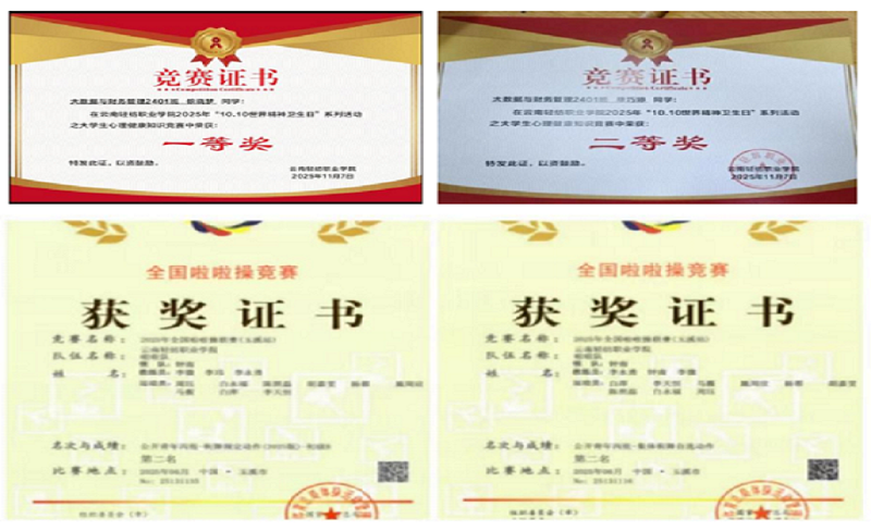 文体类:2人在2025年“10.10世界精神卫生日”心理健康知识竞赛中分获校级一、二等奖;1人随街舞社多次获全国奖项;1人获体育类奖项共计9项,并获得院级体育之星称号。