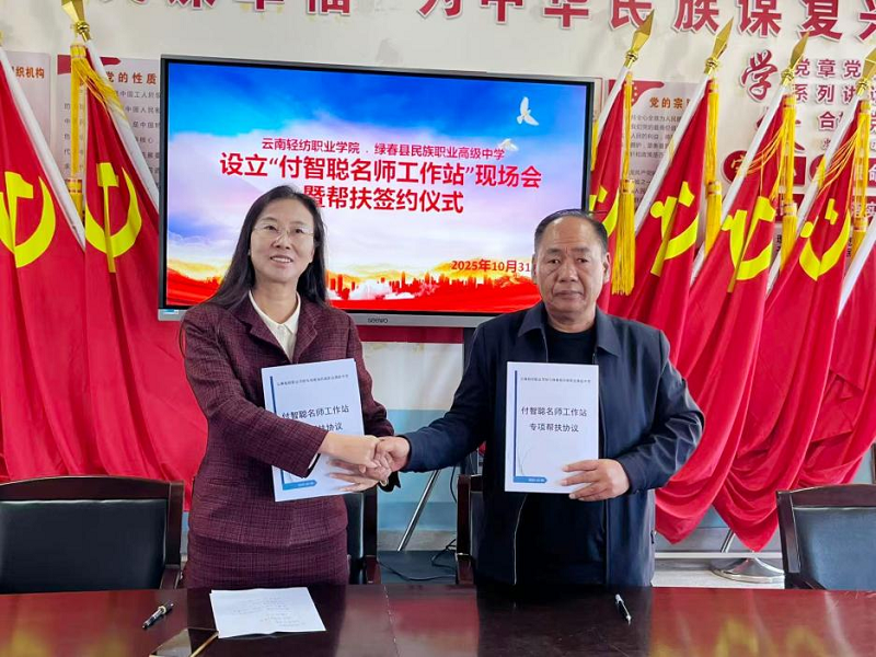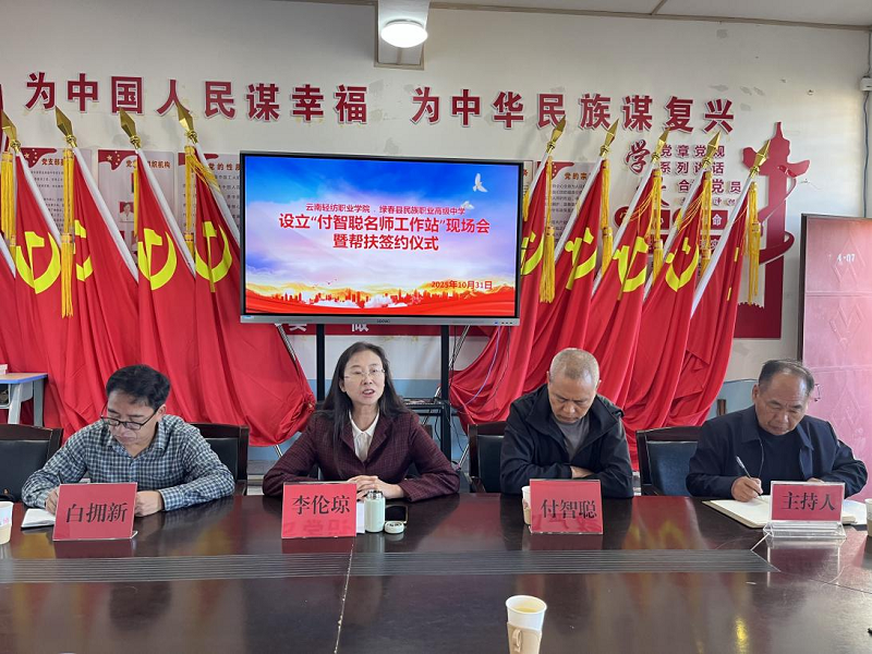 为深入贯彻落实云南省教育卫生科研工会《关于在沿边州市有关职业学校设立名师工作站的通知》精神,助力沿边地区职业教育提质增效,2025年10月30日至11月1日,校党委副书记、工会主席李伦琼率工会干事张静远及“付智聪名师工作站”负责人付智聪老师,赴绿春县民族职业高级中学举行名师工作站挂牌暨帮扶协议签署仪式。绿春县教体局副局长白拥新、绿春县民族职业高级中学校长李韩宗共同出席活动。