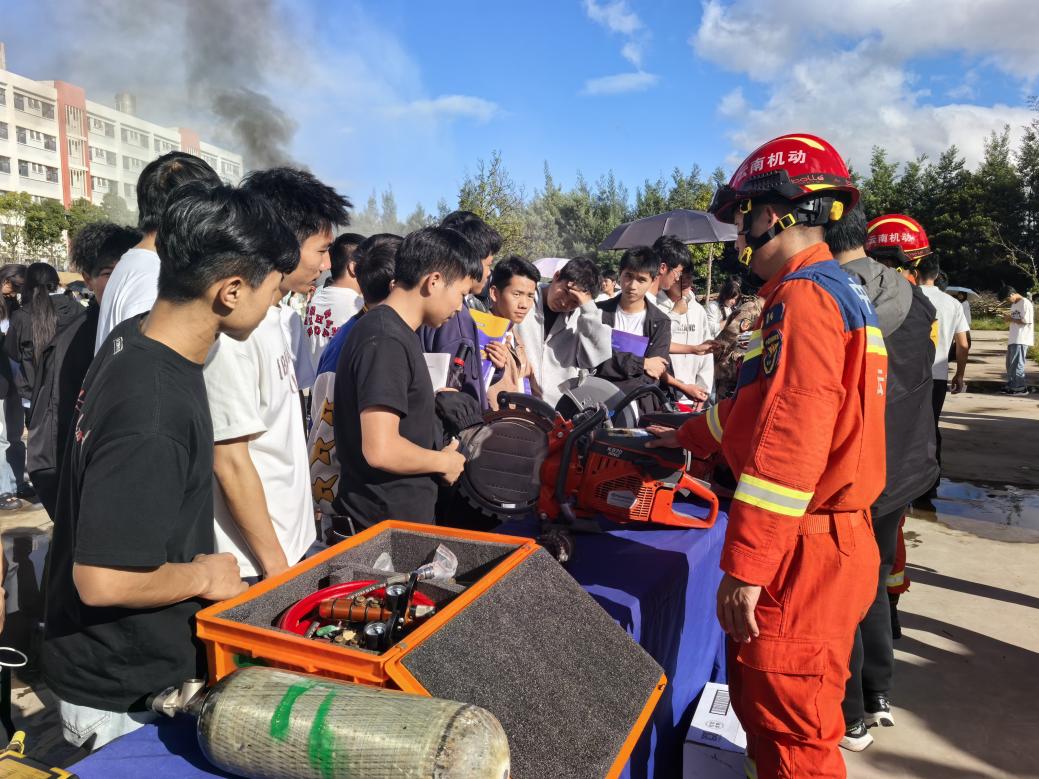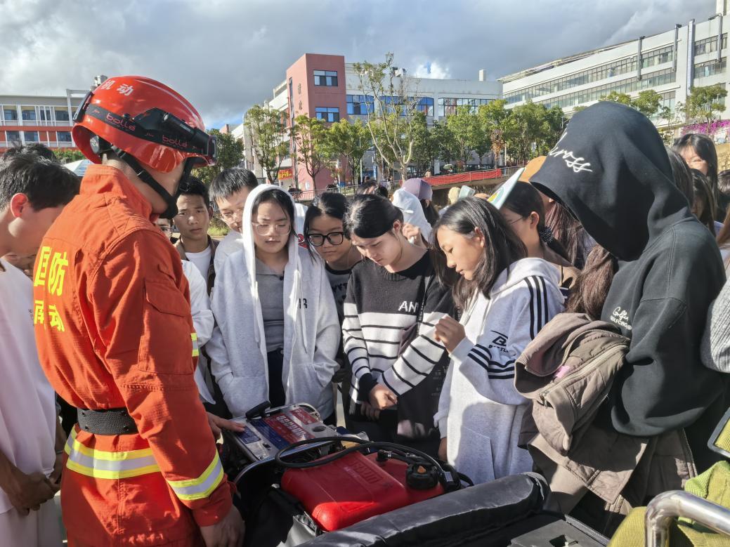 在装备展示与体验环节,学生代表在云南省森林消防总队特勤大队专业人员的指导下,近距离参观并体验了各类先进的消防救援装备,加深了对现代消防救援技术的了解,增强了对消防工作的理解与崇高敬意。