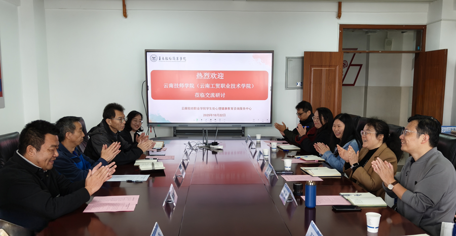 10月22日上午,云南技师学院(云南工贸职业技术学院)党委专职副书记马怡率马克思主义学院相关负责人及心理健康教育教师团队到访交流。会议在正行楼702会议室举行,我校党委委员、副校长李有进出席并致辞,学生处处长陈静林主持会议,学生处相关负责人及心理健康教育专职教师参会。