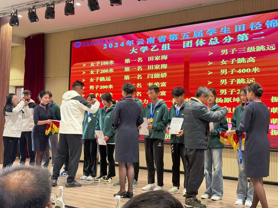 由钟南老师领队的2024年云南省第五届学生田径锦标赛大学男子、女子乙组,分别获得女子乙组100米第一名、男子乙组100米第三名、女子乙组200米第一名、男子乙组200米第二名和第七名、男子乙组400米第五名、女子乙组跳远第一名、男子乙组跳远第六名和男子乙组三级跳远第四名、女子乙组跳高第四名、男子乙组4x100米接力第一名、女子乙组4x100米接力第二名、女子乙组4x400米接力第二名和男子乙组4x400米接力第四名。田家梅、闫能娇两位同学被评为2024年云南省第五届学生田径锦标赛“优秀运动员”。