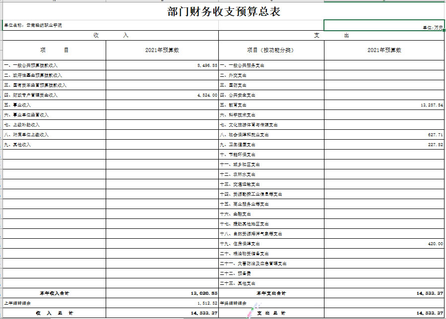 2021年单位财务总收入14533.37万元,其中:一般公共预算财政拨款8496.85万元,政府性基金预算财政拨款0万元,国有资本经营预算财政拨款0万元,事业收入0万元,事业单位经营收入0万元,财政专户管理资金收入4524万元,其他收入0万元,上年结转1512.52万元。