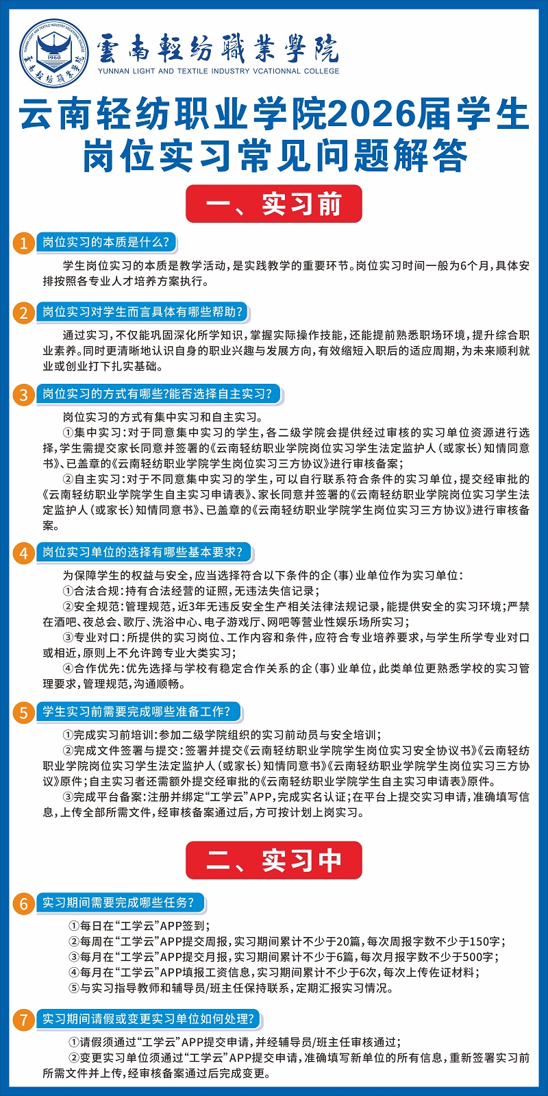 云南轻纺职业学院2026届学生岗位实习常见问题解答