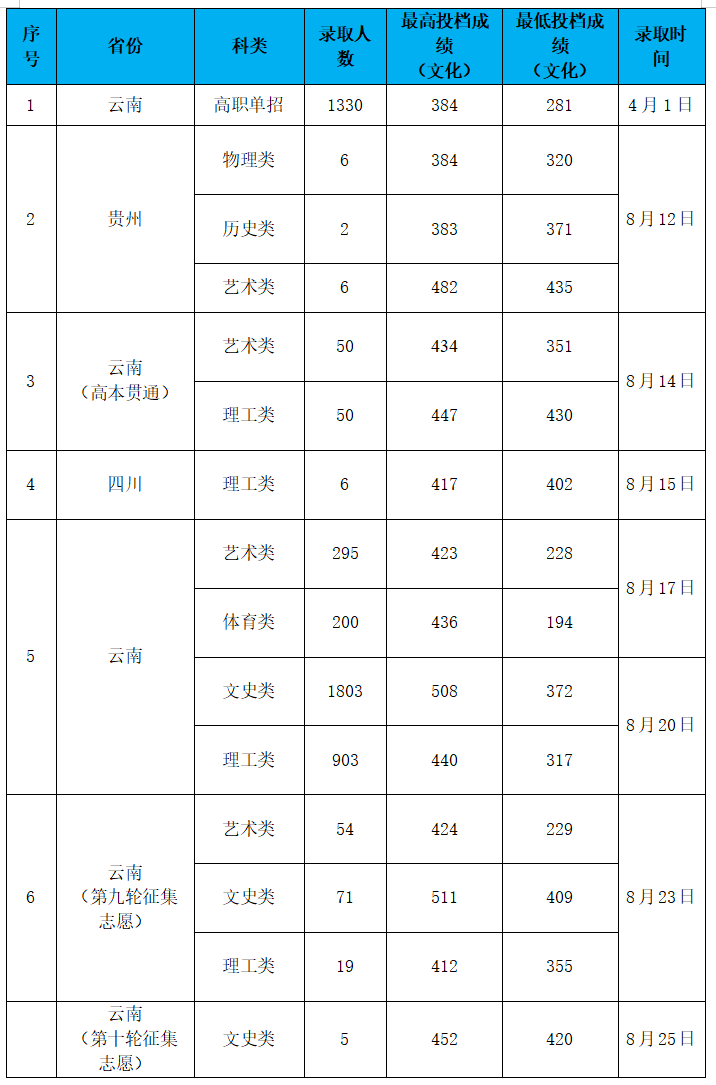 根据2024年各省、自治区招生考试委员会办公室(考试院)招生录取流程安排。截止2024年8月25日,我校已完成贵州省、云南省(高职单招、高本贯通、艺术体育类、文史理工类、第九轮征集志愿、第十轮征集志愿)、四川省的录取工作,录取批次:高职(专科),学制:三年。