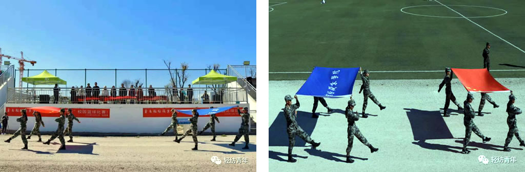 踏着庄严的正步进入会场的是国防后备连的国旗护卫队。他们昂首挺胸,迈着坚定的步伐护卫着国旗和轻纺校旗,彰显了轻纺学子的激情与活力。