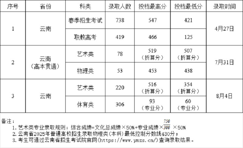 根据2025年各省、自治区招生考试委员会办公室(考试院)招生录取流程安排。截止2025年8月4日,我校已完成云南省(春季招生考试、职教高考、高本贯通、艺术体育类)的录取工作,录取批次:高职(专科),学制:三年。