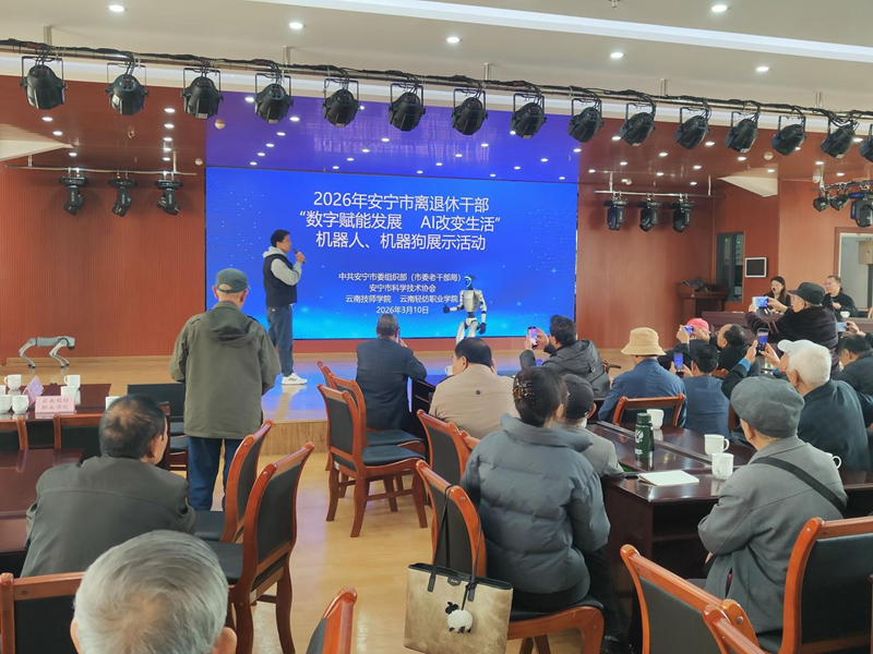 3月10日,人工智能学院学子携智能机器狗受邀参加“2026年安宁市离退休干部数字赋能发展、AI改变生活”机器人、机器狗展示活动。