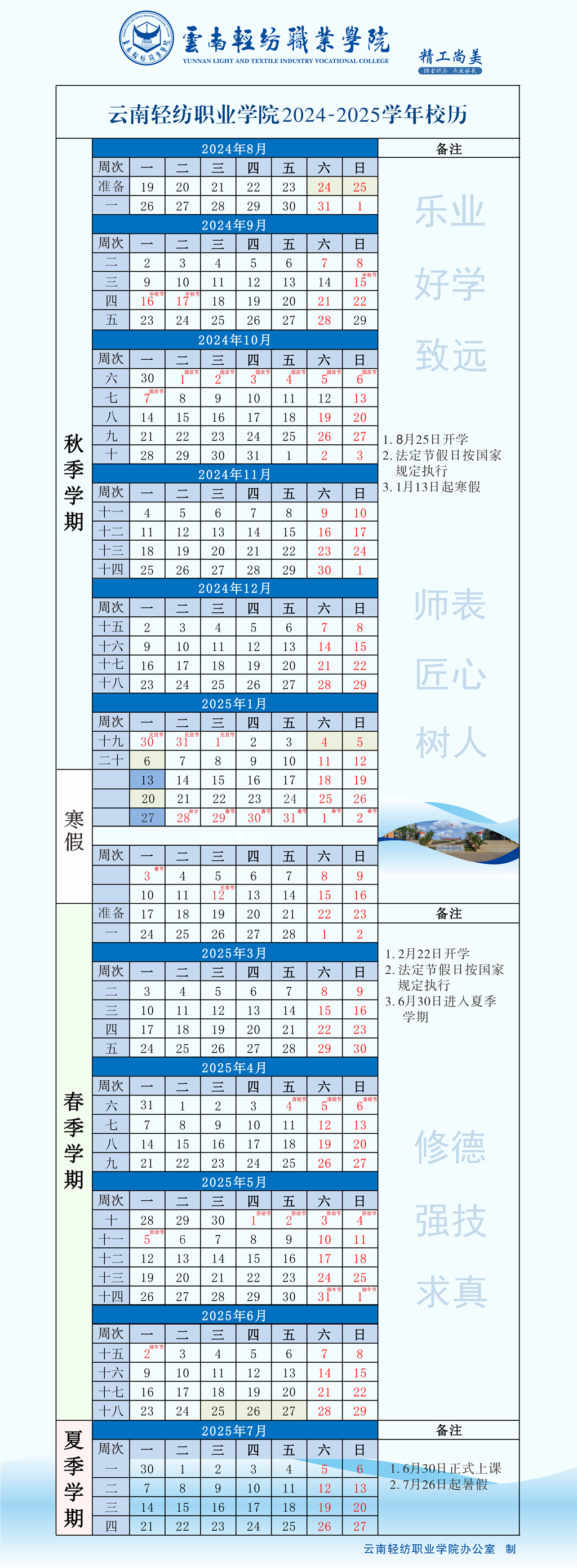 云南轻纺职业学院2024-2025学年校历
