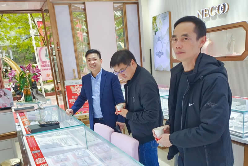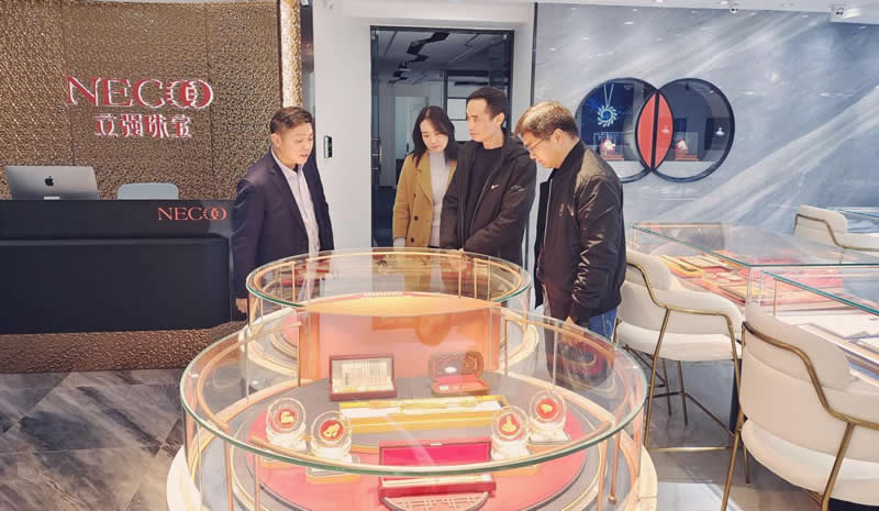 NECOO立强珠宝秉持着“创新、高效、责任、自信”的企业文化,弘扬“自强、自律、学习、创新”的企业精神,坚持最好的技术、最好的质量、最好的服务理念,提供珠宝课程开发、销售实战、终端营销训练、管理人才输出产品。调研过程中,学院一行受到公司领导的热情接待,并在公司董事长黄立强的带领下,观看了企业文化宣传片、参观了销售展台、工作环境等,深入了解企业的发展历程、生产运营、行业实践等内容。