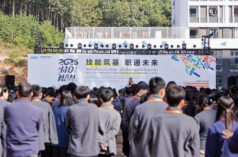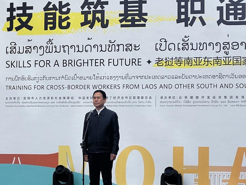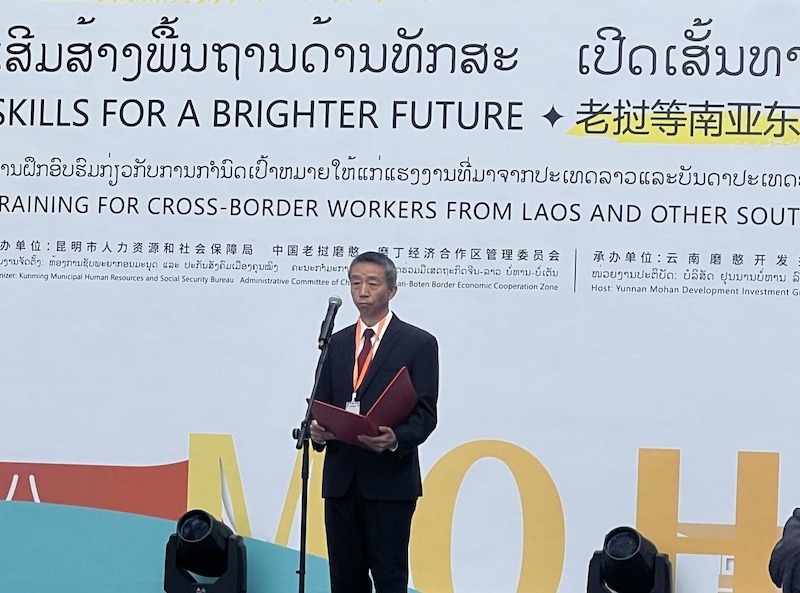 为深化中老“一带一路”合作,助力磨憨—磨丁合作区跨境产业人才培养,12月5日上午10时,由磨憨政府、磨憨开发投资有限责任公司与我校联合举办的“老挝等南亚东南亚国家跨境务工人员培训”开班仪式顺利举行。昆明市政府副市长王云林、市相关部门领导陈铸武、赵永奇、赵云川,磨憨开发投资有限责任公司董事长罗锋,云南轻纺职业学院副校长李有进,以及培训管理教学工作人员与参训学员共同出席该仪式。本次开班仪式由合作区党工委副书记、管委会主任赵明商主持。