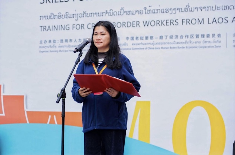 随后,老挝学员代表孙苏妮发言。她表达了对中国政府、合作区及产业园提供学习平台的由衷感谢,并表示将珍惜此次培训机会,认真学习技能,团结互助,努力成为跨国交流的桥梁,未来以所学建设家乡、传递友谊。