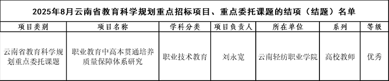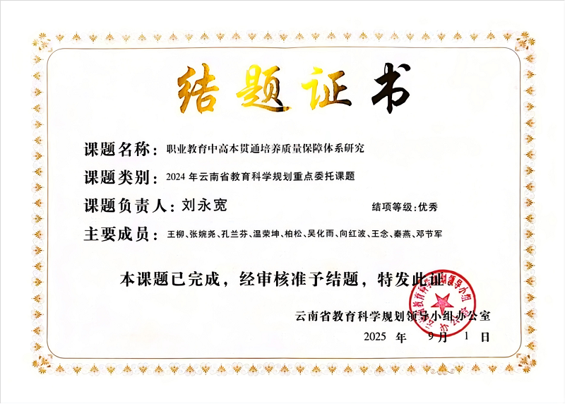 近日,云南轻纺职业学院校长刘永宽教授主持的云南省教育科学规划重点委托课题《职业教育中高本贯通培养质量保障体系研究》,经专家组严格评审顺利结题,并获评“优秀”等级。该成果为云南职业教育“中高本”贯通培养人才模式创新突破提供了关键理论支撑与实践路径,彰显了学校在职业教育领域的研究实力与责任担当。