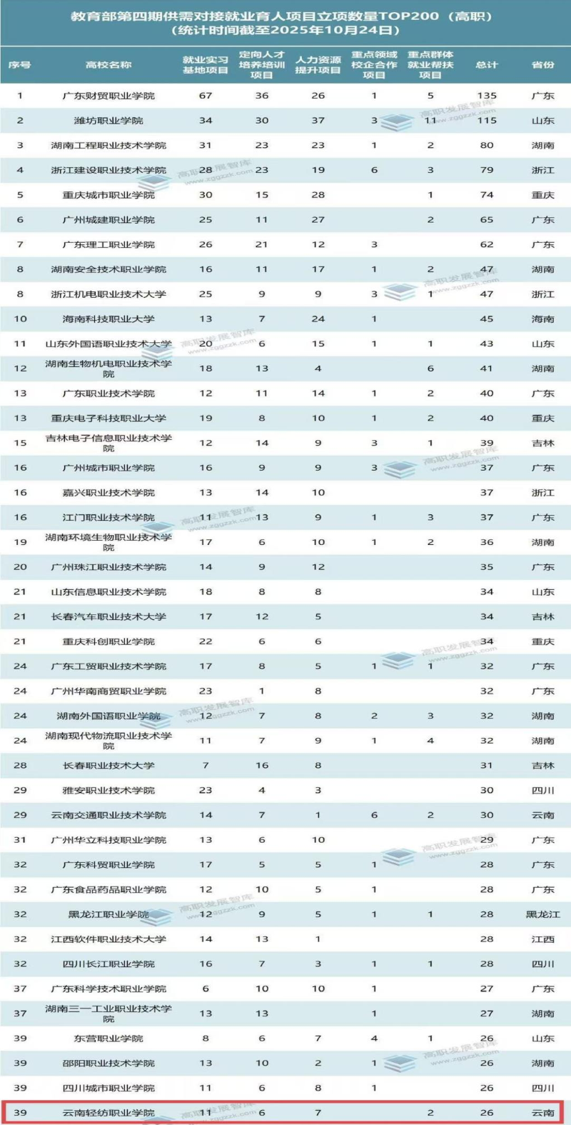 学校申报教育部第四期供需对接就业育人项目26项全中!立项总数位列全国高职院校第39位,居云南省第2名!近日,教育部公布了2025年第四期供需对接就业育人项目立项名单,学校申报的26个项目全部成功获批,实现100%通过的“满堂红”!立项总数位列全国高职院校第39名,居云南...