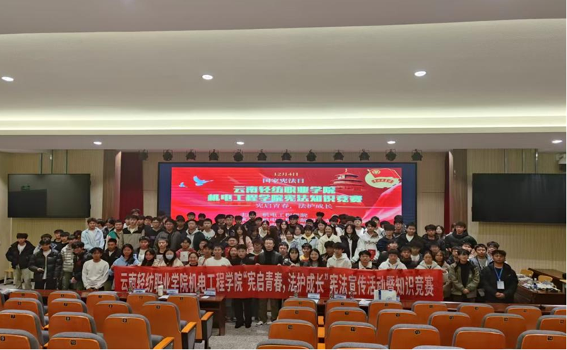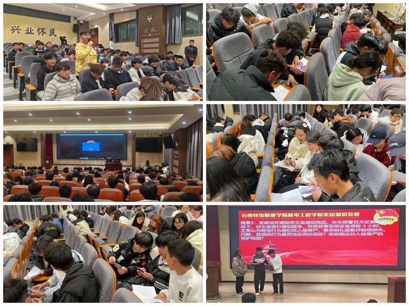 为深入学习贯彻法治思想,切实强化大学生宪法法治教育,12月4日,机电工程学院团总支在苏芳厅组织开展“宪启青春,法护成长”主题宪法宣传暨知识竞赛活动。本次活动面向全体在校学生,发挥入党积极分子和共青团员示范引领,以“以赛促学”的创新形式,推动宪法教育走深走实,进一步筑牢青年法治根基。