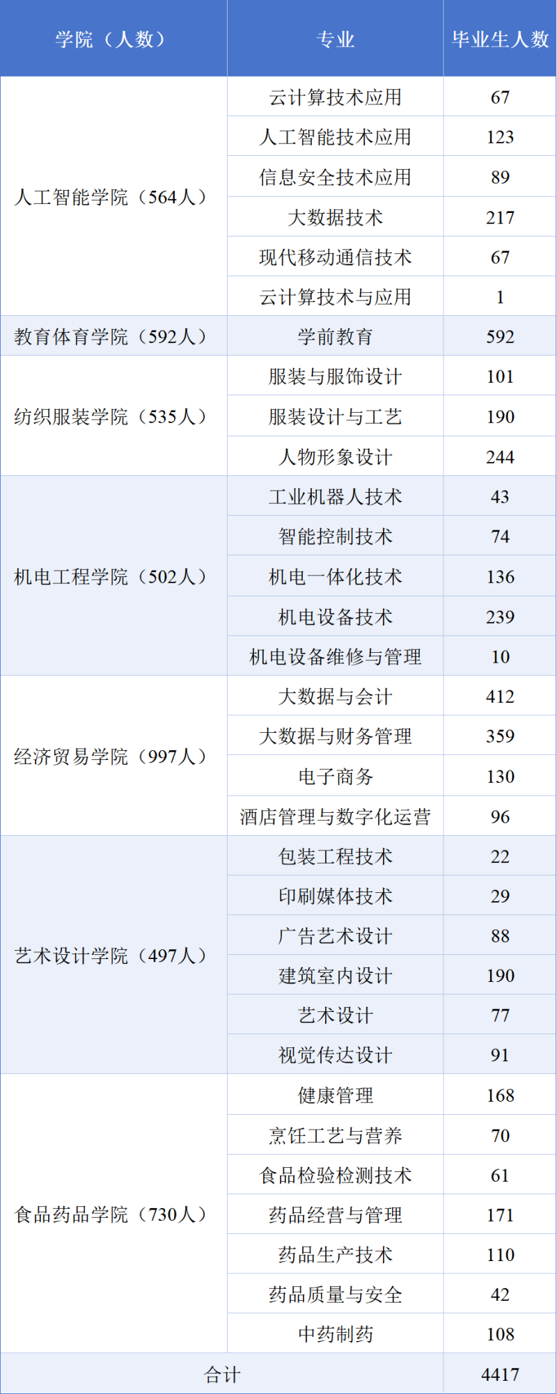 云南轻纺职业学院2025届共有毕业生4417人,专业情况具体如下: