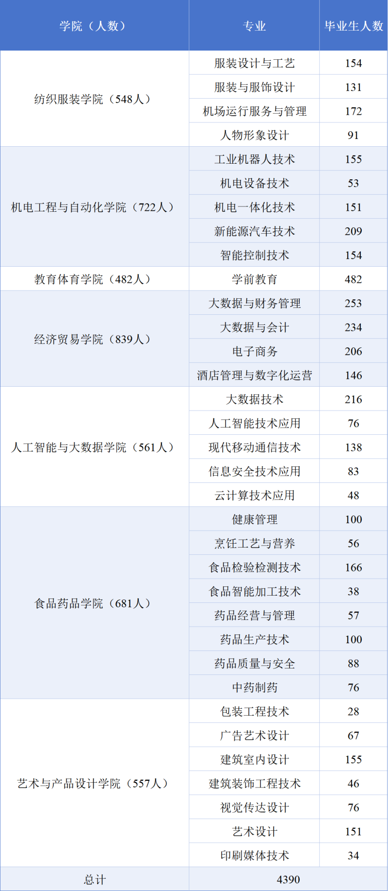 云南轻纺职业学院2026届共有毕业生4390人,专业情况具体如下: