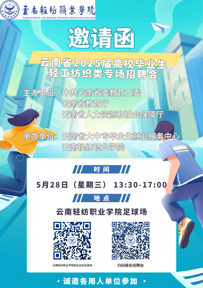 为全面落实党中央、国务院决策部署和省委、省政府就业工作要求,进一步提升毕业生就业创业工作质量,为毕业生搭建方便快捷、精准高效的就业服务平台,确保2025届轻工纺织类毕业生更加充分更高质量就业,我校于5月28日举办云南省2025届高校毕业生轻工纺织类专场招聘会,诚邀广大用人单位参加。具体事宜如下: