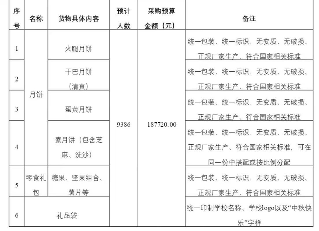 7.采购需求:云南轻纺职业学院拟对2025级、2024级在校学生及2023级专升本留校学生(共计9386人)中秋节慰问进行竞争性磋商采购,采购内容详见下表,详细清单及要求见《竞争性磋商文件第五章采购内容及相关要求》。