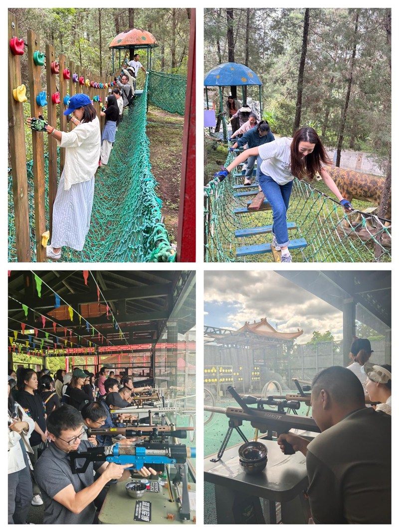 活动中,教职工分组参与了多项融入自然、贴近生态的体验项目。在“丛林穿越”环节,大家穿梭于林荫绿道,切身感受生物多样性与生态平衡的重要性;徒步过程中,教职工漫步山水之间,直观领略“绿水青山就是金山银山”的生动实践;射击项目则在专业指导下安全开展,进一步强化了纪律意识和团队协作能力。